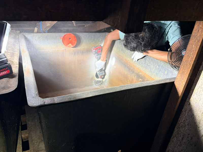 Feb 17-18 Tue-Wed 29-30 Shakban 1447H, dealt with the leaking water tank in the ceiling which supply the washroom of R-01, and of the guest WR-02, all were in g-floor. Fixing the cracked tank was not successful. The shortcoming was that it was not fully dry when araldite was applied. All planned, things were getting worse and worse every improvement, innovative steps were carried out, including with the help of Muzani. In the end, the final strategy was to recover the tank from the leaking by re-resin-ing the surface, which would take perhaps to after raya. The current effort was to make the WR-03 and 04 in u-floor useable. And accomplished by 1st Ramadan night with ASRI help. Draining the floor water was also achieved but gradually through the overflow line.