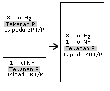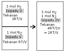 Nota: Sebelum pencampuran: Isipadu H2 = 3RT/P; Isipadu N2 = RT/P; Isipadu jumlah = 4RT/P. Selepas pencampuran: Isipadu = (3+1)RT/P = 4RT/P.